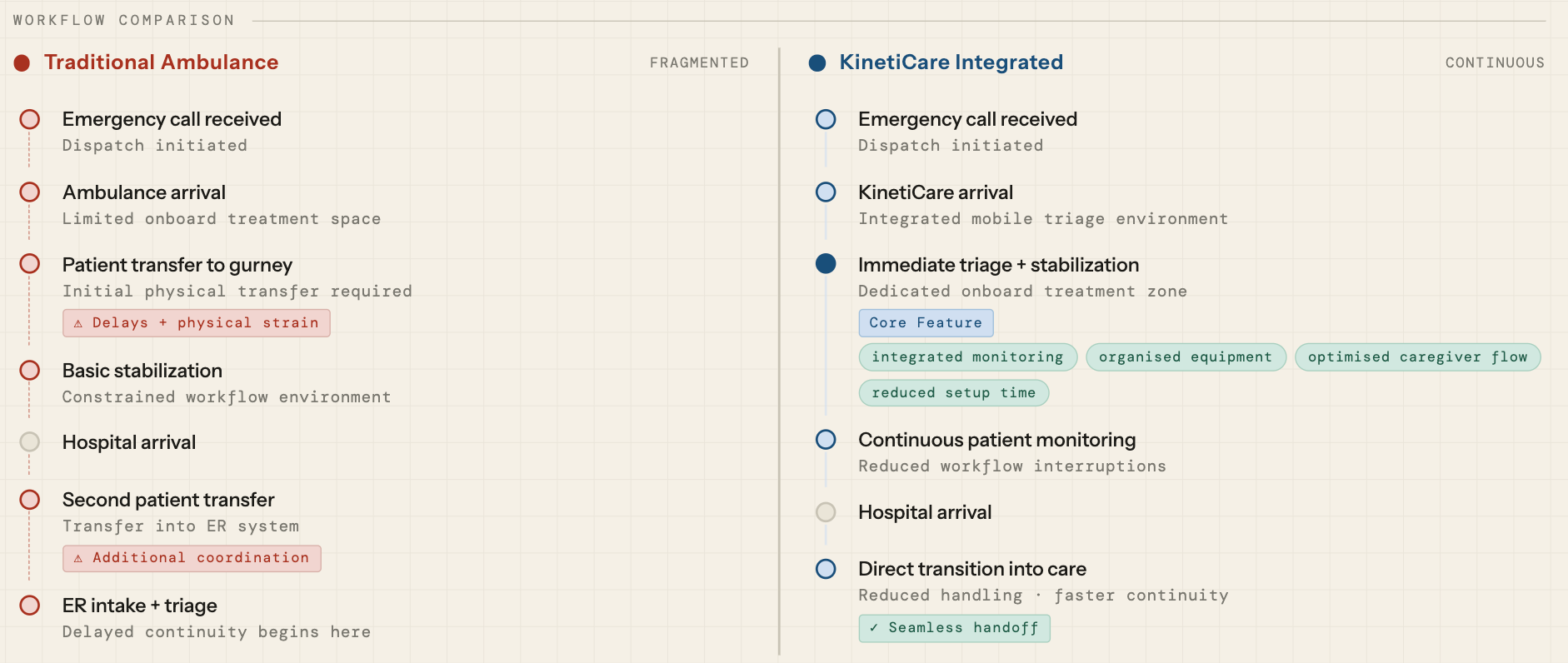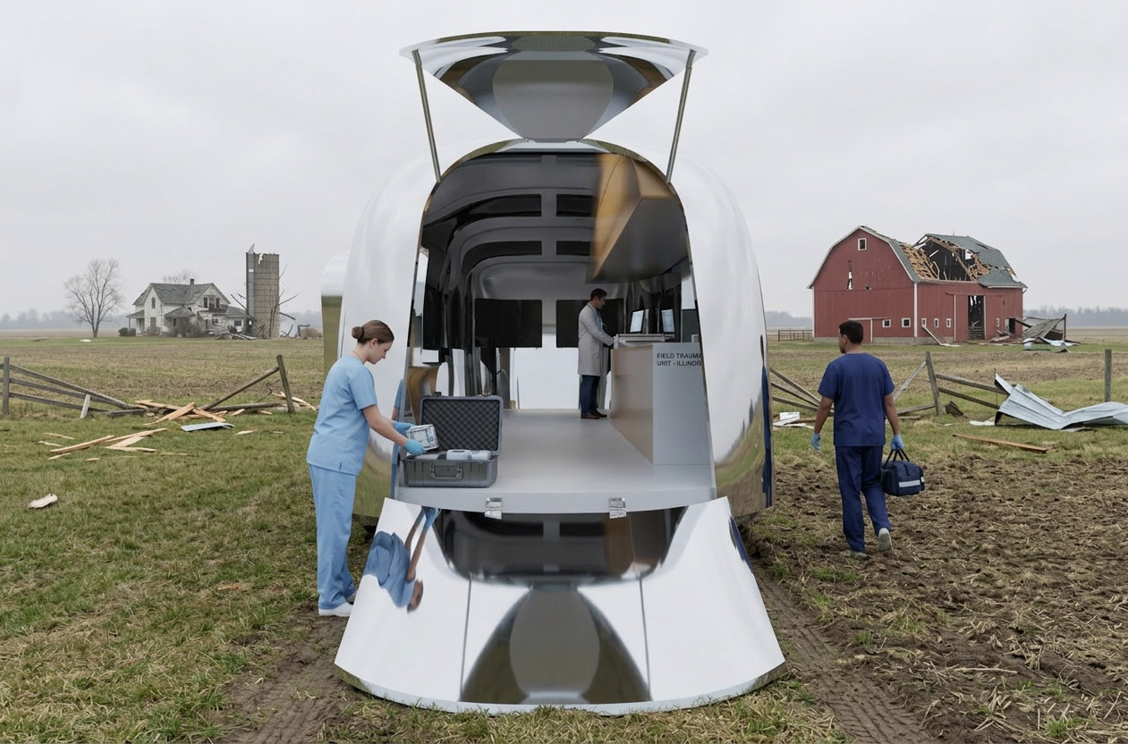 KinetiCare is a mobile medical triage system designed for rapid deployment in disaster-stricken areas across the Midwest. The project explores how spatial design, product integration, and workflow planning can work together to reduce cognitive load for first responders operating in high-stress environments.